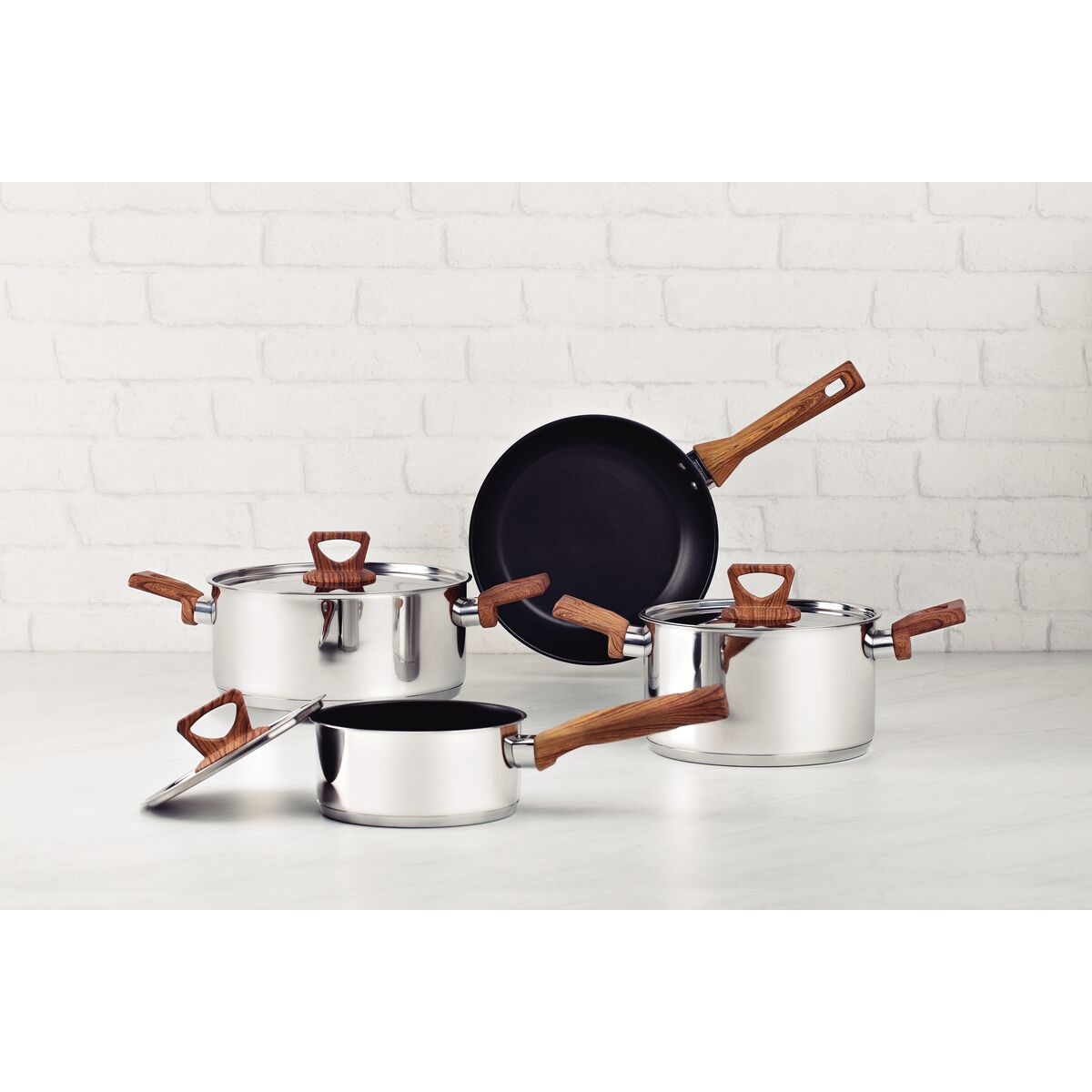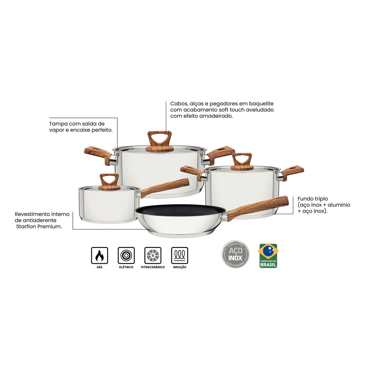 Componentes: cabos, alças e pegadores em baquelite com acabamento soft touch aveludado com efeito amadeirado proporcionando um manejo mais suave.