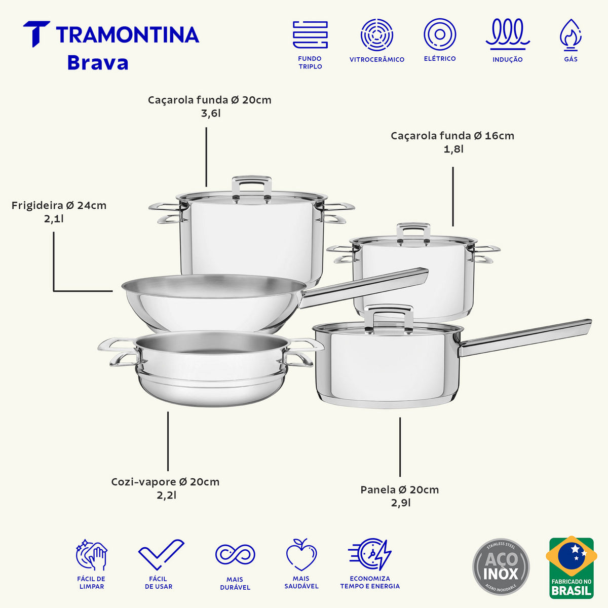 O Jogo de Panelas Tramontina em Aço Inox Fundo Triplo com Tampa Plana 5 Peças é ideal para quem aprecia a mistura de traços modernos com a elegância do aço inox para deixar sua cozinha linda. As panelas da linha Brava possuem fundo triplo, uma camada de alumínio revestida por duas de aço inox, que ajuda a distribuir melhor o calor e permite economizar tempo e energia, mantendo a temperatura da comida por mais tempo. Podem ser usadas em qualquer tipo de fogão e lavadas diariamente em máquina de lavar louças. O jogo de panelas é perfeito para quem adora funcionalidade e beleza na sua cozinha.