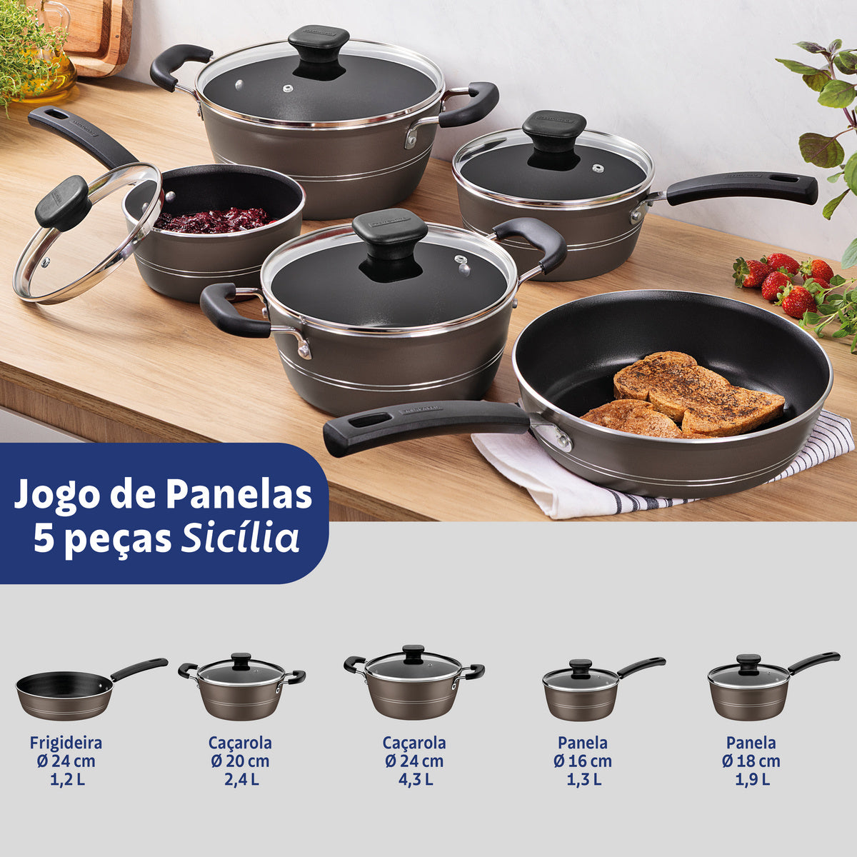 Corpo de alumínio com espessura de 3 mm que proporciona cozimento rápido e uniforme.